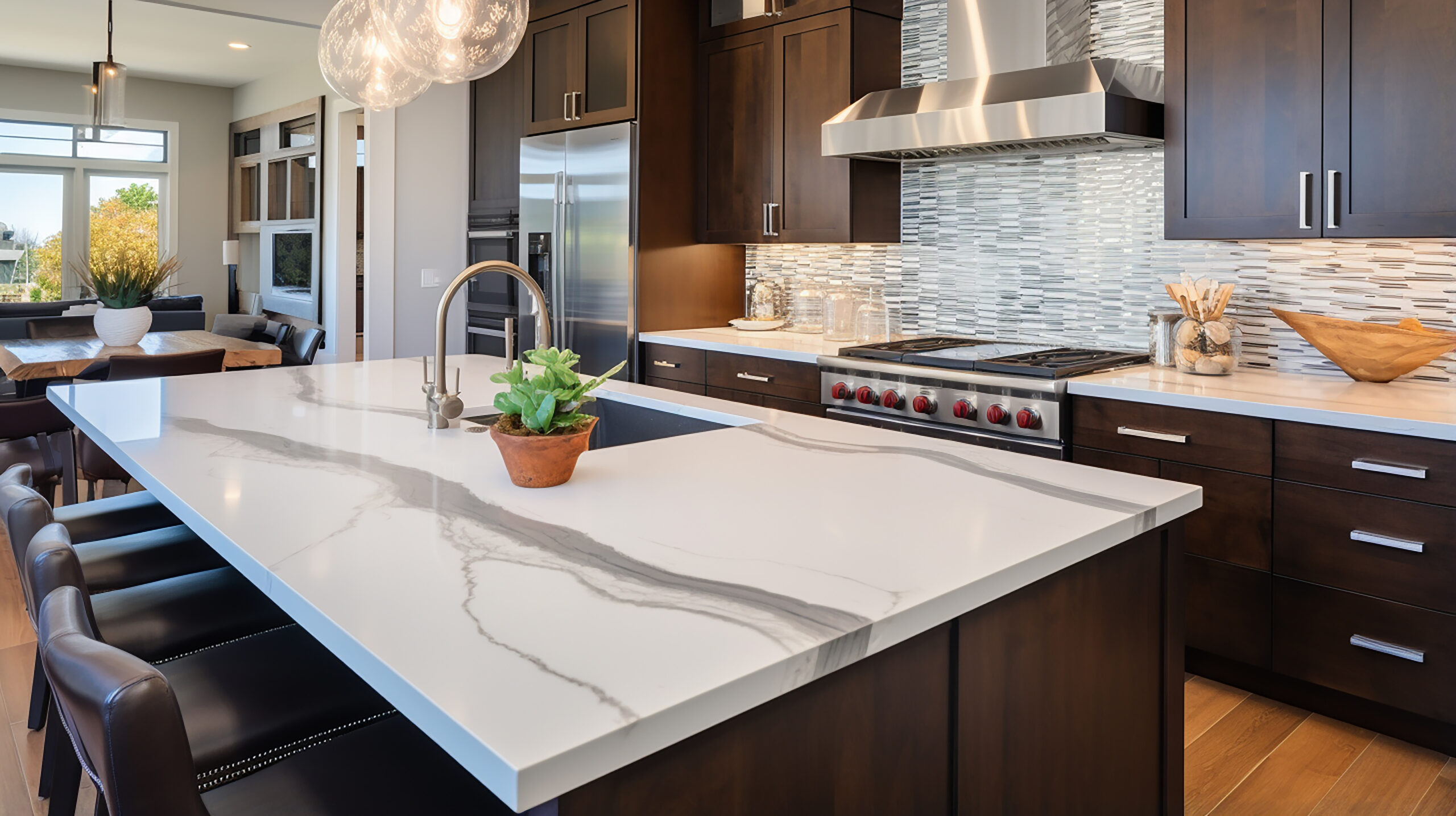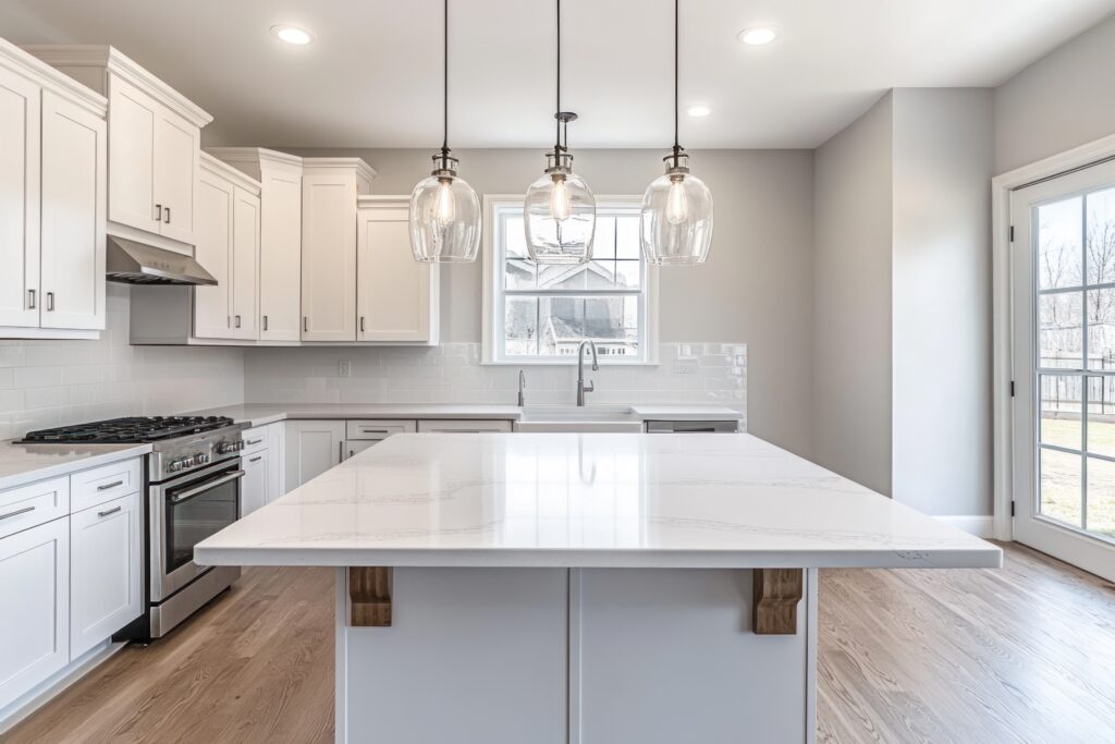 Modern kitchen island with white cabinets, quartz countertop, and glass pendant lights.